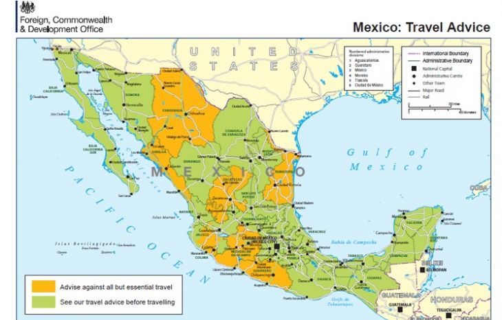En una alerta emitida por la Oficina de Asuntos Exteriores, de la Commonwealth y de Desarrollo (FCDO, en sus siglas en inglés) desaconsejó todo viaje no esencial a Chihuahua, Sinaloa, Zacatecas, Tamaulipas, Colima, Guerrero, Michoacán, Baja California, Guanajuato y Jalisco.