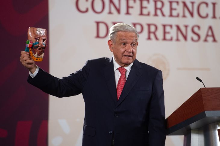El presidente Andrés Manuel López Obrador recibió este jueves, en la conferencia mañanera, una máscara elaborada por artesanos de Chichén Itzá. Se trata de un artículo tallado que fue realizado en Pisté, municipio donde se encuentra la referida zona arqueológica.