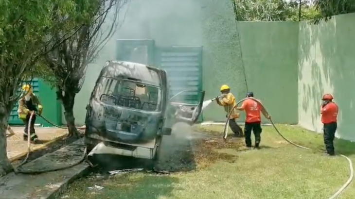 Casi al mismo tiempo, una camioneta de la empresa Coppel, fue proyectada a la puerta de acceso con varios petardos al interior, lo que provocó que se incendiara.