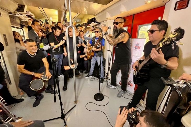 En un recorrido de 26 minutos, Panteón Rococó armó una inusual y sorpresiva fiesta en los vagones del Tren Suburbano, con el Concierto en movimiento, que puso a vibrar a los viajantes desde la estación Buenavista a Cuautitlán.