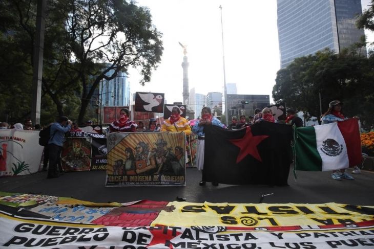 En el contexto del 12 de octubre, a 531 años del “inicio de la resistencia” y a 27 años de la fundación del Congreso Nacional Indígena (CNI), integrantes de agrupaciones originarias, estudiantiles y sociales, así como miembros de comunidades zapatistas, marchan del Ángel de la Independencia hacia el Zócalo capitalino.