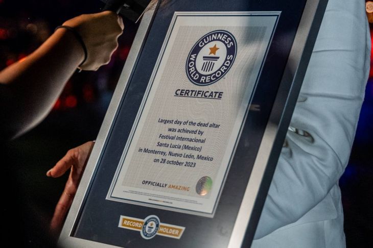 Un altar de mil 212 metros cuadrados, colocado en la explanada del Museo de Historia Mexicana para conmemorar el Día de Muertos en Nuevo León, consiguió el certificado oficial de récord Guinness, dejando atrás la anterior marca que era de mil 44 metros cuadrados.