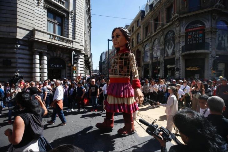 En su travesía por México, La Pequeña Amal, la marioneta que representa a una niña siria refugiada y recorre en mundo con un mensaje de esperanza para las poblaciones desplazas por la guerra, la violencia y la persecución, marchó por calles del Centro Histórico, del Zócalo al Palacio de Bellas Artes.