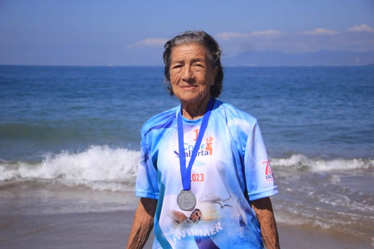 Ana María Georgina Diez Aguilar, de 94 años de edad, fue reconocida por los organizadores de Cruce Vallarta como la deportista más longeva de la competencia de natación dentro del mar pacífico.