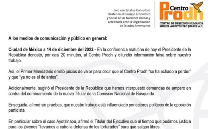 En respuesta a las acusaciones del presidente Andrés Manuel López Obrador de que el Centro de Derechos Humanos Miguel Agustín Pro defendió a víctimas y victimarios en el caso de la desaparición de los jóvenes de Ayotzinapa, el organismo rechazó las imputaciones las que consideró "falsedades y descalificaciones especialmente graves porque provienen del Jefe del Ejecutivo".