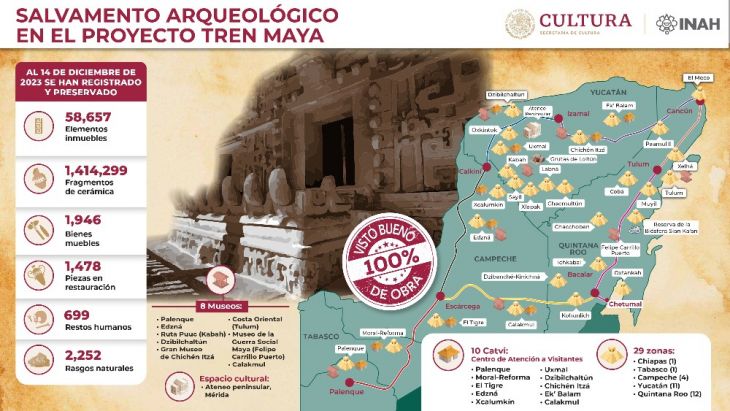 De acuerdo con el INAH, el rescate arqueológico a lo largo de la ruta del Tren Maya ha documentado más de 54 mil elementos arquitectónicos (caminos, albarradas, plataformas, unidades habitacionales, áreas residenciales, basamentos piramidales y otras estructuras), así como más de un millón 220 mil fragmentos de cerámica.