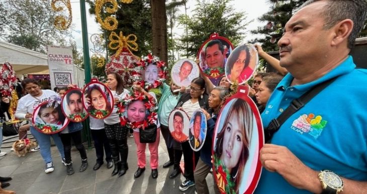 Familiares de personas desaparecidas en Veracruz colocaron esferas navideñas con el rostro de los desaparecidos en los municipios de Xalapa, Coatepec, Las Vigas y Emiliano Zapata, en un árbol que forma parte de las áreas verdes del parque Juárez, de la capital del estado.