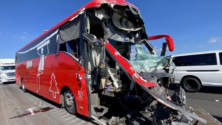 De acuerdo con los primeros informes, el accidente se registró debido a que el autobús de pasajeros, en el que viajaban 40 personas, no guardó suficiente distancia y chocó contra el tráiler doble tolva.
