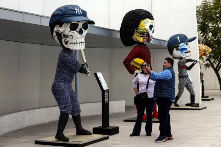 Entre las figuras destaca una escultura de José Guadalupe Posada, el caricaturista mexicano que creó el personaje de la Catrina, la calavera viviente.