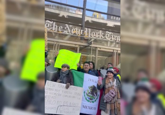 Con pancartas y mensajes en inglés y español, mexicanos residentes en Estados Unidos que simpatizan con Morena se manifestaron en las puertas de The New York Times en protesta por la publicación el jueves pasado de que en ese país se investigaron presuntos vínculos de funcionarios cercanos al presidente Andrés Manuel López Obrador con operadores del narco.