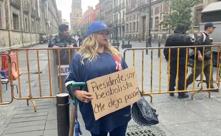 Con un letrero con la leyenda: “Presidente, soy beisbolista, ¿me deja pasar?”, la madre buscadora lamentó que el presidente mire a las madres de México que han enfrentado la pérdida de un familiar como “oposición o politiquería”. Ayer acudió con una pala que usa para la búsqueda de sus hijos.