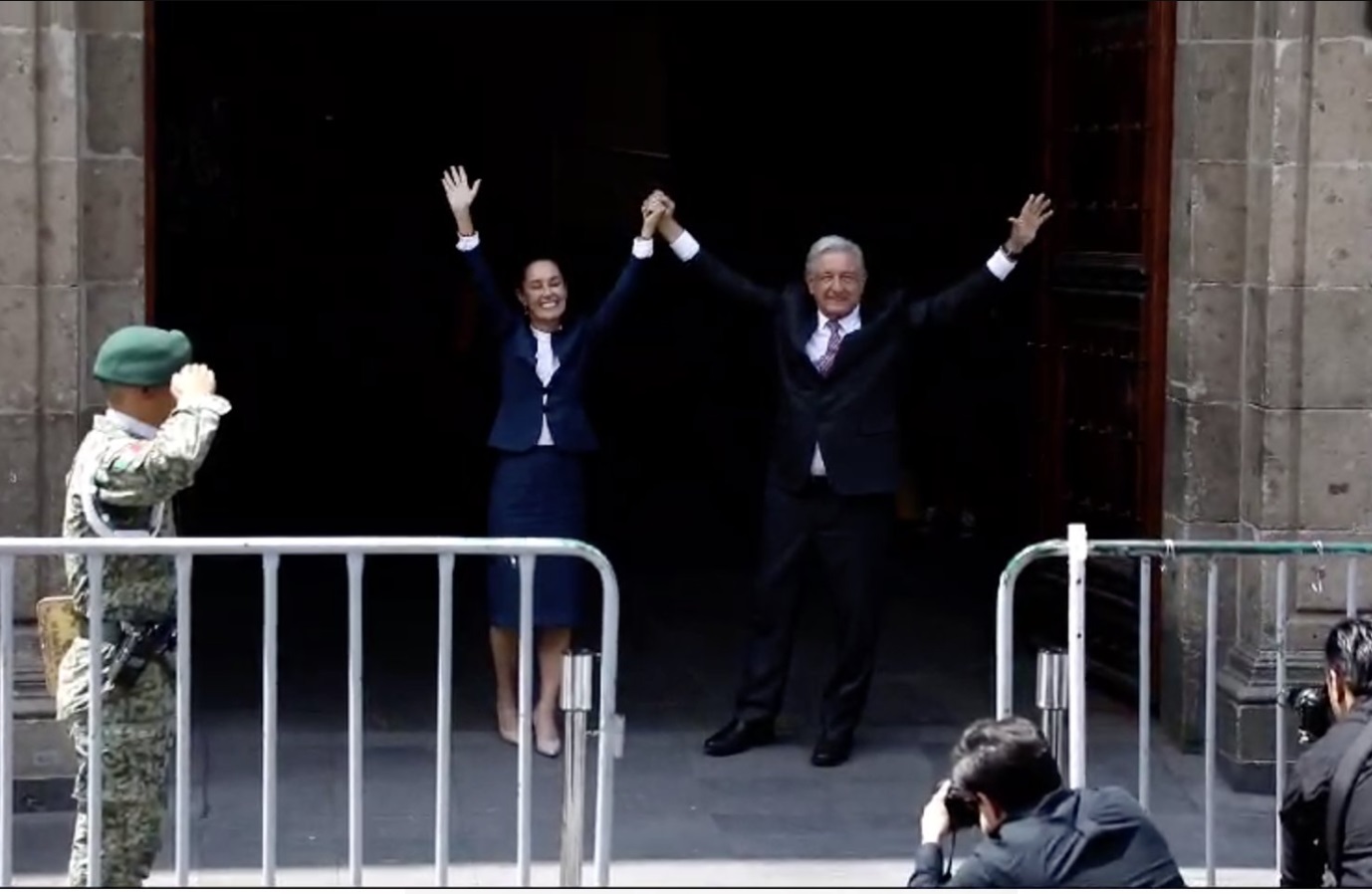 Saludo a algunos ciudadanos y recibió algunos documentos. Cuando se enfilaba hacia la puerta de Corregidora 8, de manera sorpresiva se abrieron las puertas de par en par y apareció el presidente López Obrador, quien la recibió con un gran abrazo y un beso. Posteriormente, le alzó el brazo en señal de victoria.
