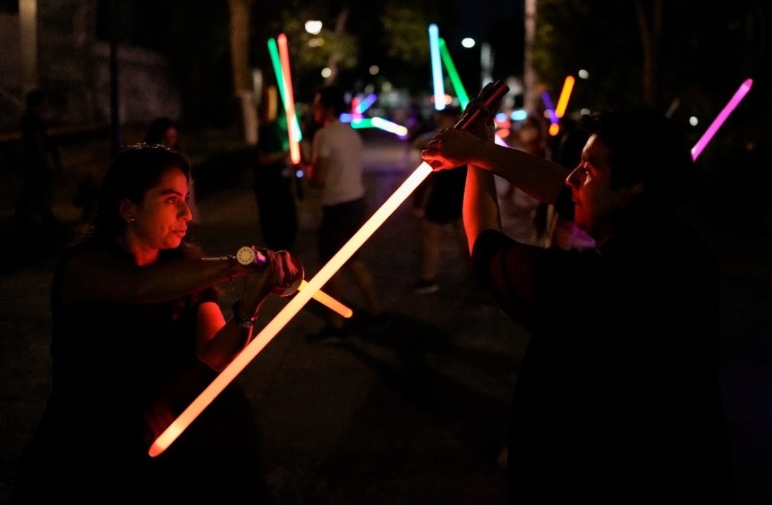 Un parque en el sur de Ciudad de México se ilumina con el brillo multicolor de los sables láser, mientras un hombre que blande una espada luminiscente blanca en el aire les grita que revisen su defensa.