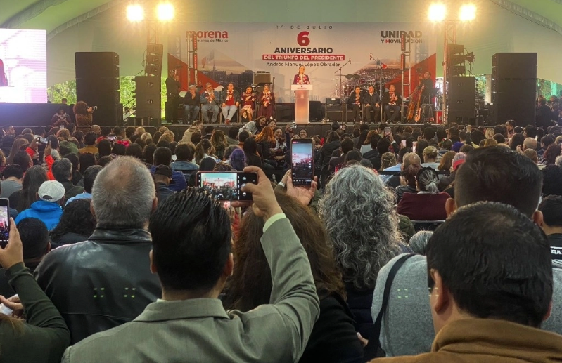 Sheinbaum Pardo encabezó este lunes un acto organizado por Morena en el Centro Cultural Los Pinos para conmemorar los comicios de hace seis años, con los que López Obrador llegó a la presidencia.