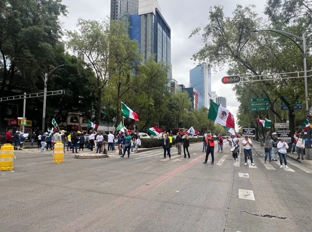 Este sábado los trabajadores del sector judicial se manifiestan de manera intermitente sobre Paseo de la Reforma, a la altura de la calle de París. Mientras el semáforo se pone en rojo, se colocan en la vialidad y protestan con matracas, cornetas y ondeando banderas de México contra la reforma que plantea la elección de ministros, jueces y magistrados mediante el voto popular.