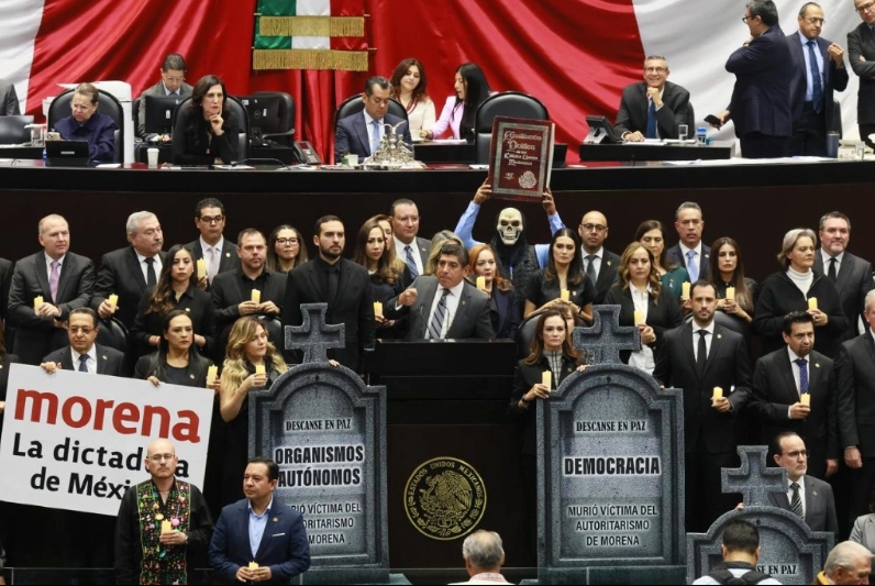 En sentido contrario, la panista Annia Sarahí Gómez Cárdenas subió a tribuna acompañada por el resto de los legisladores blanquiazules –quienes vistieron de negro y mostraron veladoras y lápidas de utilería, con las frases “estado de derecho” y “poder judicial”—para advertir que la “supremacía constitucional” significa la muerte de la república.