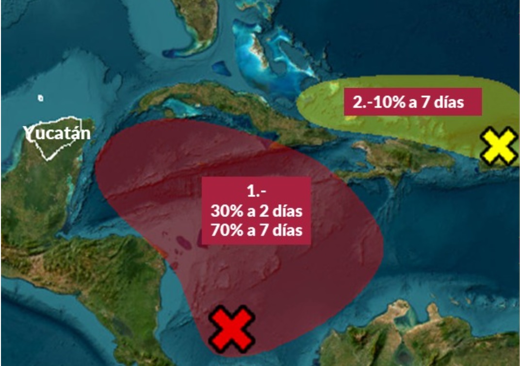 Se mantienen en vigilancia dos áreas de Baja Presión localizadas en el Mar Caribe, ambas con potencial de desarrollo ciclónico, una de ellas se encuentra frente a las costas de Panamá a unos mil 300 kilómetros al Sureste de Yucatán y la segunda cerca de Puerto Rico a 2 mil 300 km al este de la isla, informó la Coordinación Estatal de Protección Civil (Procivy).