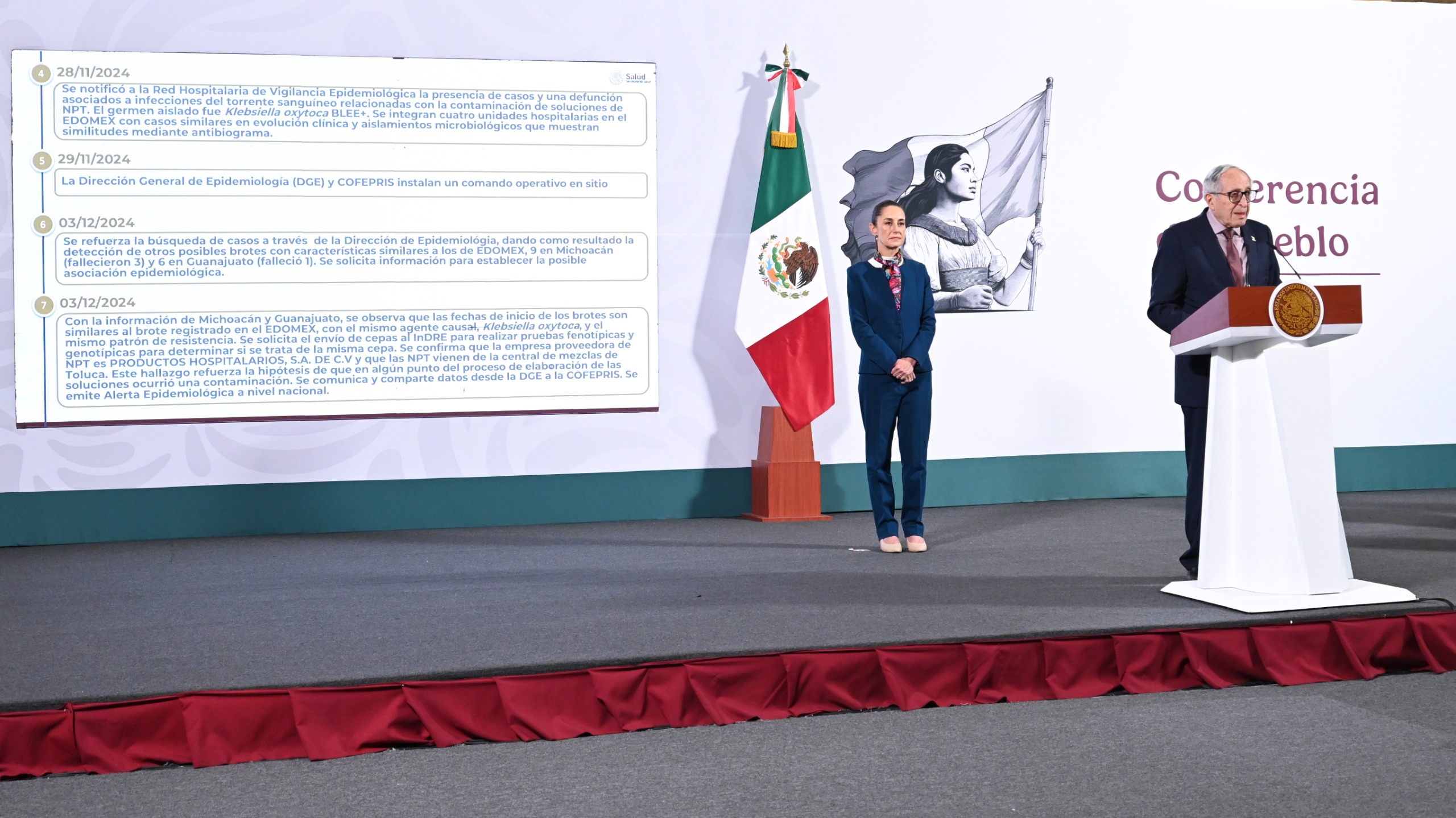 En la mañanera de la presidenta Claudia Sheinbaum Pardo, el funcionario indicó que se aislaron los lotes de los suplementos alimenticios que se suministran a las víctimas mortales —provenientes de un centro de mezclas de Toluca, Estado de México y producidos por la empresa Productos Hospitalarios, la cual fue