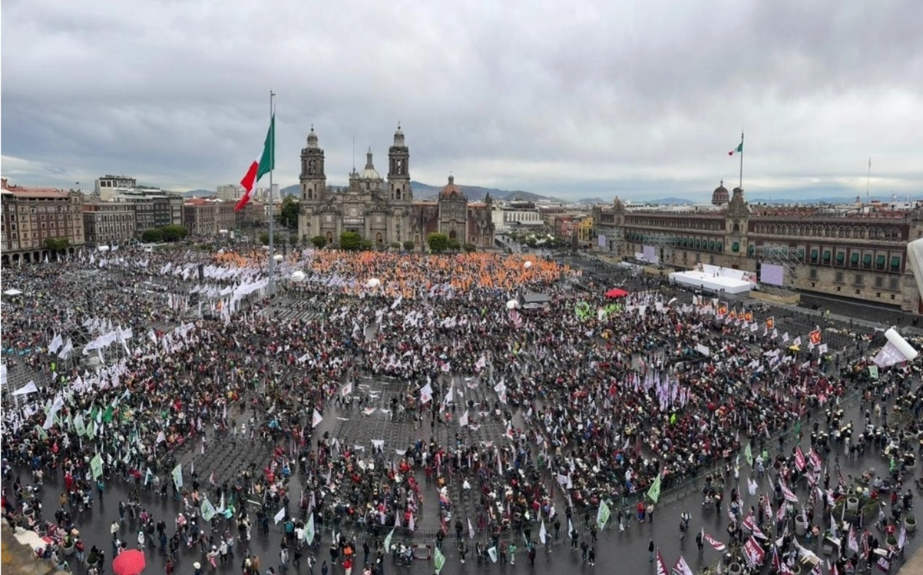 La amenaza de llovizna o el frío no impidieron que miles de personas llegarán de diferentes estados del país para asistir al Informe por los primeros 100 días de gobierno de la presidenta Claudia Sheinbaum en el Zócalo Capitalino.