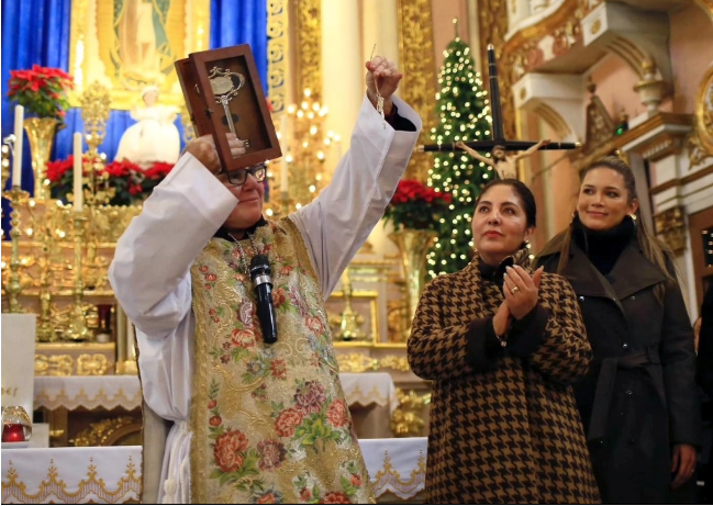 "Todas las ceremonias especiales, por la importancia que le revisten, están reglamentadas para fines y efectos legales, tanto para su aprobación como su ejecución. Por no sujetarse al protocolo reglamentario, el haberle colgado una llave a la imagen de La Preladita, terminó siendo como colgarle un ex voto o milagrito por parte de la esposa del presidente municipa"l, y la esposa del gobernador David Monreal, añadió.