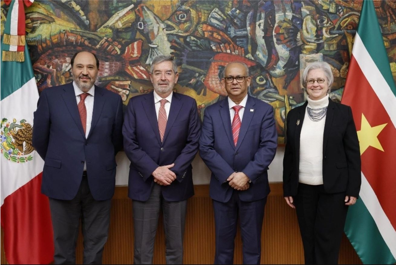 El canciller Juan Ramón de la Fuente junto con el jefe de Oficina de la Presidencia, Lázaro Cárdenas, y la subsecretaria para América Latina, Raquel Serur, sostuvo una reunión de trabajo con el ministro de Relaciones Exteriores de Surinam, Albert Ramdin, quien realiza una visita a México.