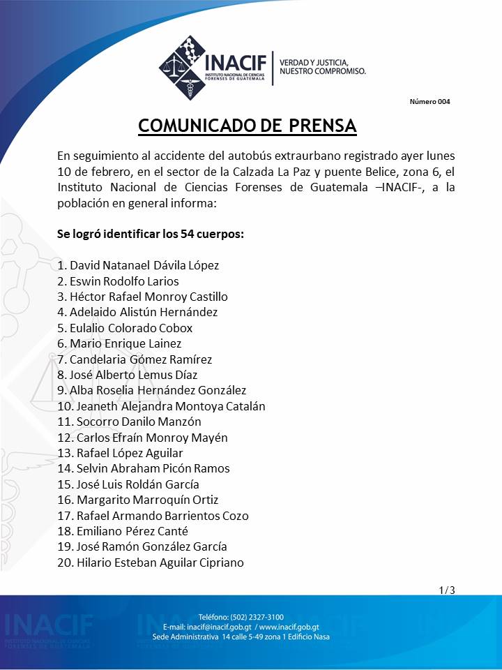 Los últimos reportes refieren que hasta ahora suman 55 muertos por el accidente en el que un autobús que cayó a un barranco en el norte de la capital de Guatemala y al menos una decena de heridos. Ya se identificaron a 54 víctimas.