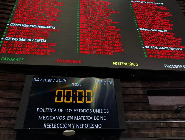 La Cámara de Diputados aprobó en lo general la reforma a la Constitución para prohibir la relección consecutiva y el nepotismo electoral, aunque esta última medida aplicará hasta 2030, tal y como dispusieron los senadores.