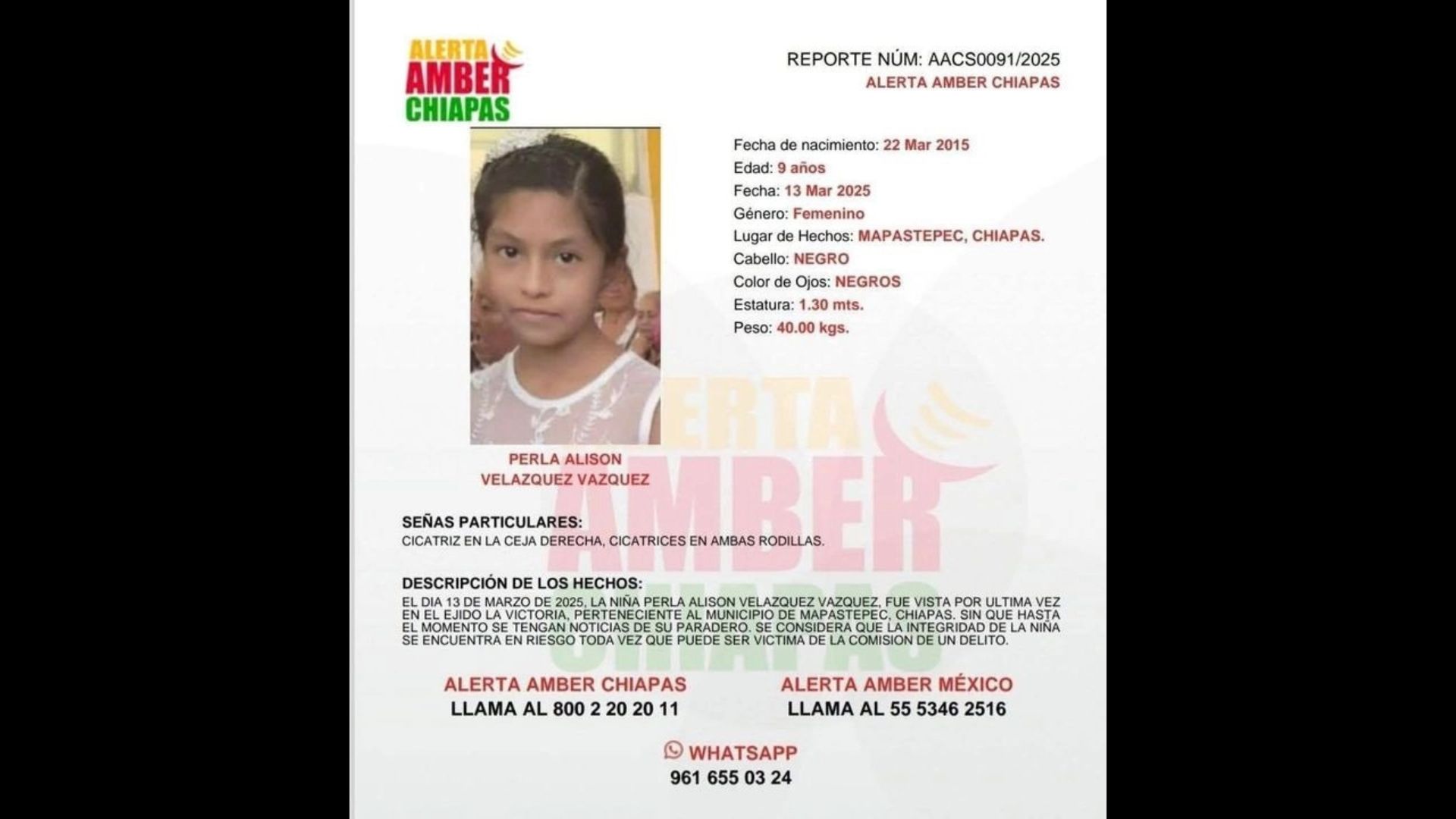 Alison fue raptada en la comunidad Pantaleón Victoria, en la zona rural de Mapastepec. Luego que la madre de la menor denunciara la desaparición (por la que se emitió la ficha de búsqueda AACS0091/2025), pobladores de esa comunidad emprendieron una exhaustiva búsqueda.