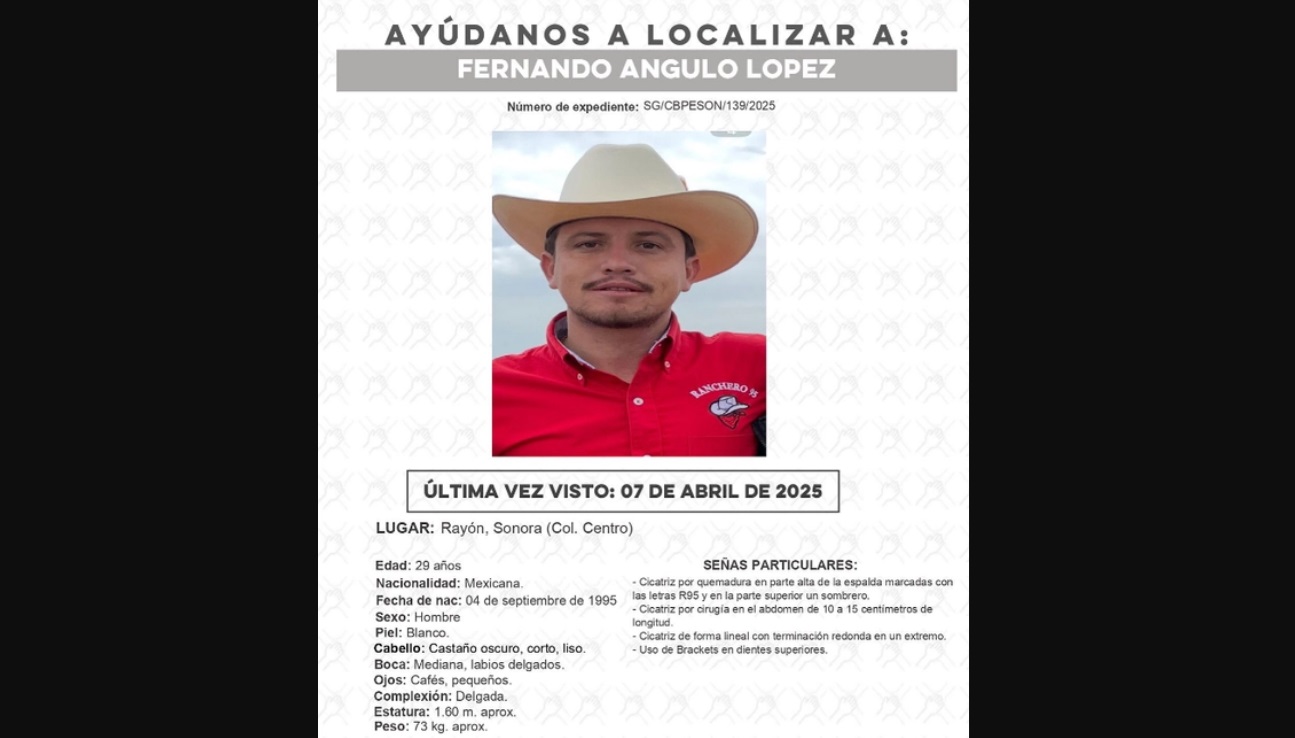 La última ubicación conocida de Angulo López se sitúa en la colonia centro del municipio de Rayón, en la sierra alta de Sonora. Sin embargo, la ficha oficial para su localización se activó hasta la mañana de este lunes 14 de abril.