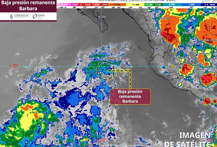 El ciclón tropical Barbara se desplazará hacia el sur de Baja California Sur y se espera que en las próximas horas se debilite a un sistema de baja presión remanente, informó este martes el Servicio Meteorológico Nacional (SMN).