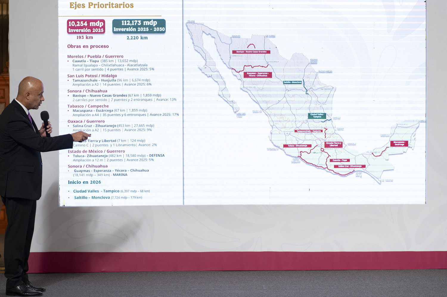 Durante la conferencia de prensa presidencial, el funcionario explicó que además se asignarán 30 mil millones de pesos en el mantenimiento de la red carretera federal, con el programa conocido como Bacheton, el cual contará con un presupuesto de 225 mil millones de pesos a lo largo del sexenio.