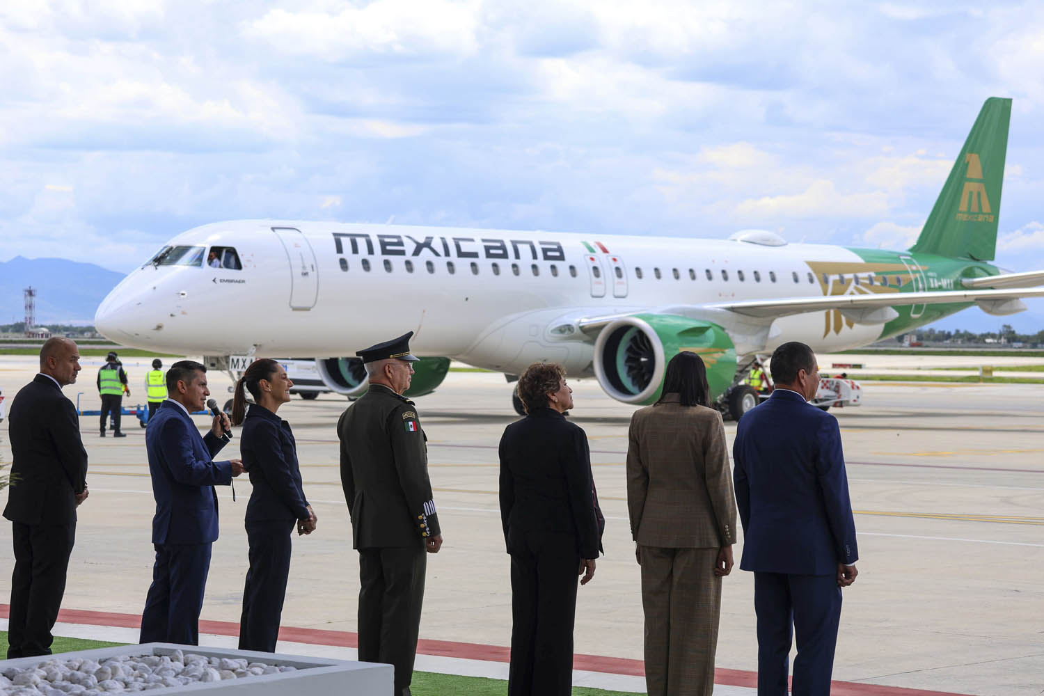 Acompañada por la gobernadora del estado de México, Delfina Gómez, el titular de Defensa, Ricardo Trevilla Trejo, y Jesús Antonio Esteva Medina, secretario de Infraestructura, Comunicaciones y Transportes (SICT), la jefa del ejecutivo expuso que “Mexicana de Aviación no es solo un logotipo ni una flota de aviones, por lo demás llegarán 20 entre este año y el próximo, es una declaración de principios, es el mensaje claro de que México quiere volar alto, pero con los pies en la tierra, con rumbo, con justicia y con orgullo nacional.
