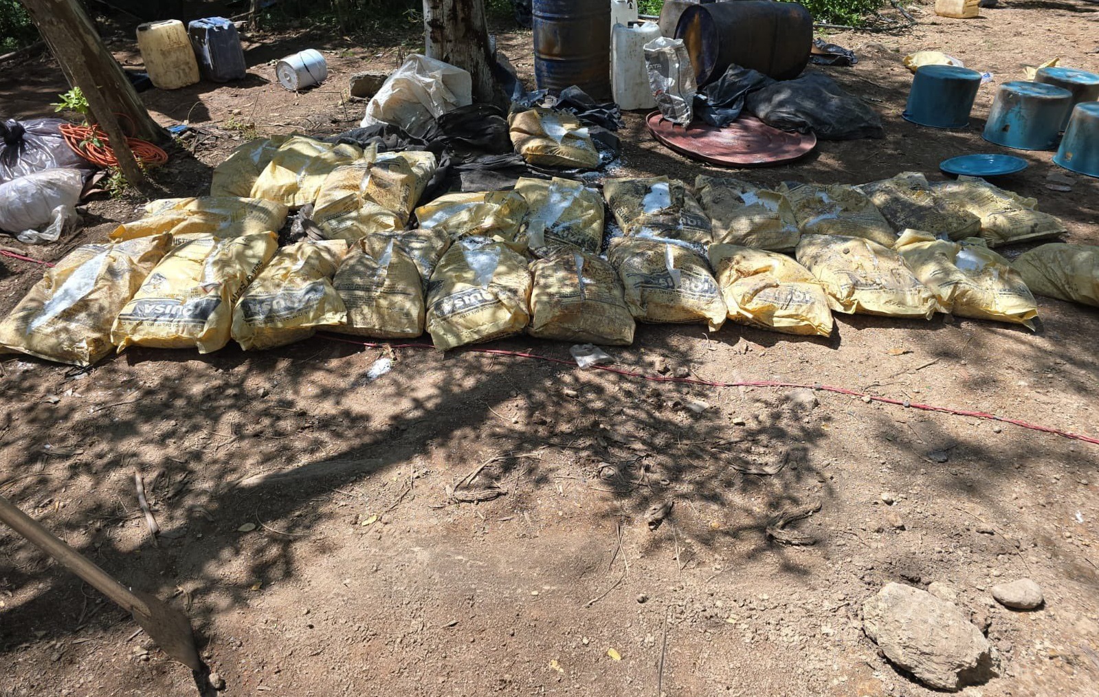 El hallazgo se realizó durante reconocimientos terrestres en una zona serrana identificada como bastión del cártel de “los Mayos”. Ahí, personal naval desmanteló dos laboratorios clandestinos y confiscó precursores químicos esenciales para la fabricación de drogas sintéticas: mil litros de ácido clorhídrico, 200 litros de ácido acético, mil litros de tolueno, 200 litros de cianuro de bencilo, 250 litros de P2P, 575 kilos de sosa cáustica y 200 kilos de cianuro de sodio.