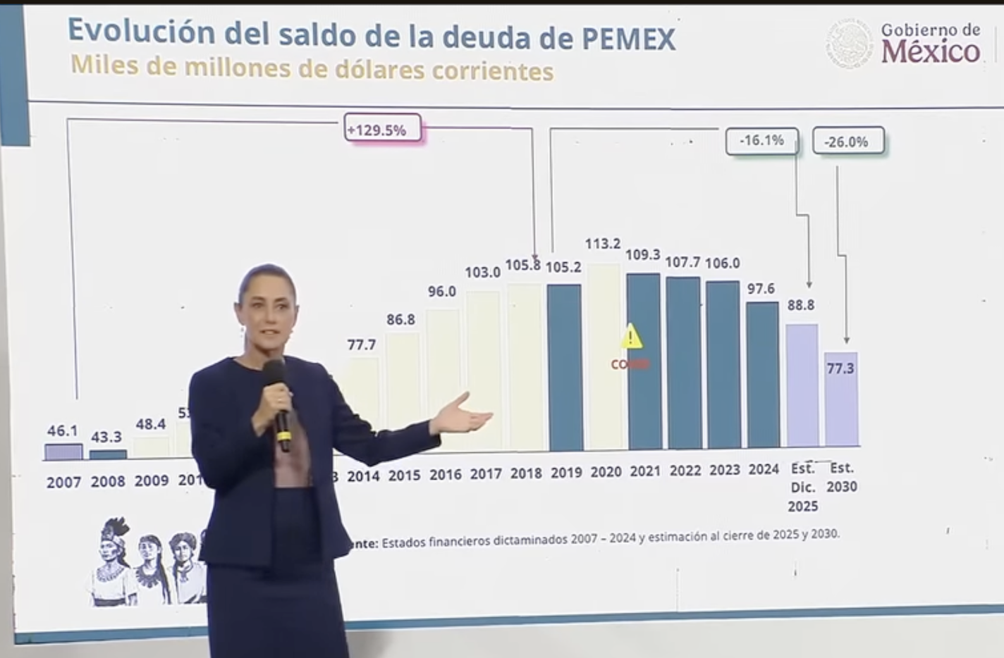 En su explicación hizo un particular énfasis en la evolución de la deuda de Pemex que pasó de 43 mil millones de dólares a 60 mil millones de dólares en el sexenio de Calderón y con Peña subió hasta 113 mil millones de pesos. Al respecto, el secretario de Hacienda, Édgar Amador dijo que en 2025 y 2026 había un vencimiento de 46 por ciento, y tan solo en 2026 serán 26 por ciento.