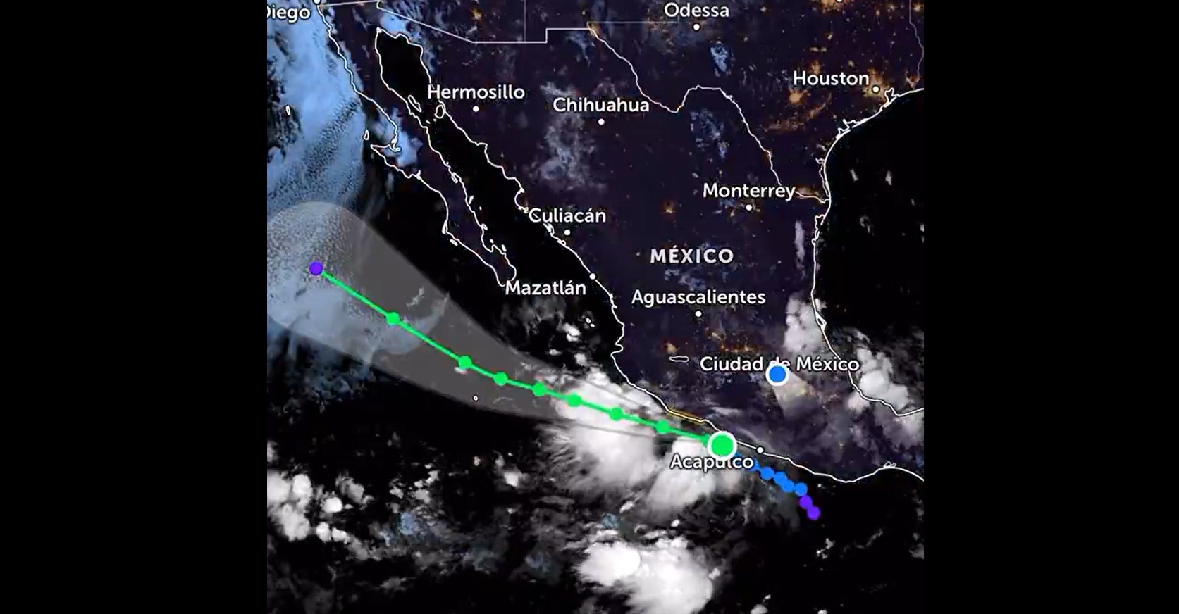 A las 09:00 horas, tiempo del centro de México, el fenómeno se localizó a 65 kilómetros al sur-suroeste de Zihuatanejo, Guerrero, y a 95 kilómetros al sur-sureste deLázaro Cárdenas, Michoacán, con vientos máximos sostenidos de 65 kilómetros por hora y rachas de 85.