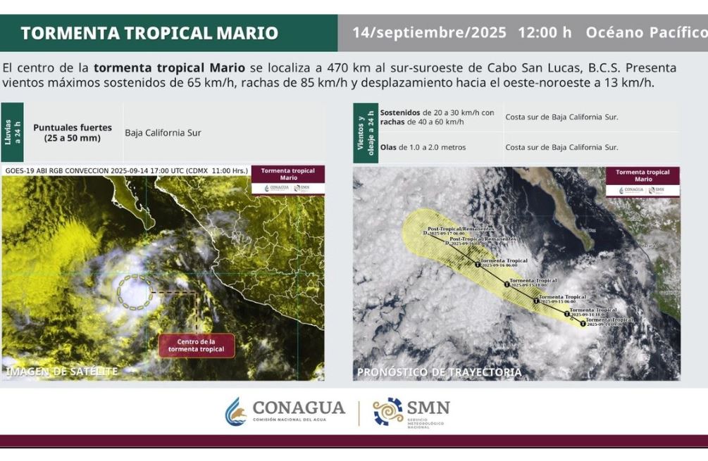 Mario se intensificó nuevamente a tormenta tropical este domingo cerca de Baja California Sur, luego de que sus remanentes volvieron a ordenar, informó el Servicio Meteorológico Nacional (SMN).