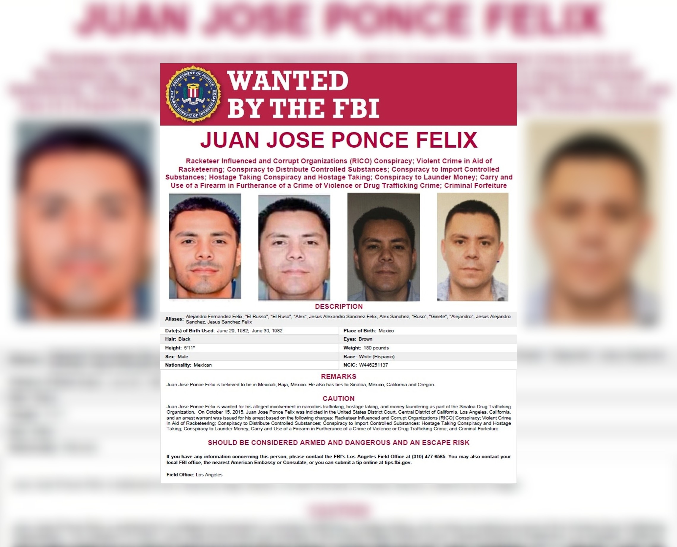Indicó que “durante la última década, Ponce Félix ha sido acusado varias veces en los distritos central y sur de California por cargos de crimen organizado, tráfico de drogas, armas de fuego y lavado de dinero”.