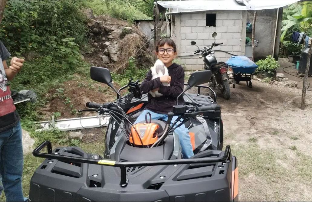Cuanto la pequeña vio la cuatrimoto se emocionó y abrazó a Carolina y en cuanto se la entregaron se subió.