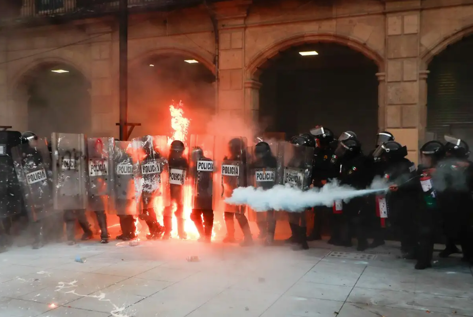 Mientras se desarrollaba el mitin, un grupo del bloque negro irrumpió y atacó a elementos del extinto cuerpo de granaderos, que se apostaron en el ala poniente del Zócalo, entre 16 de Septiembre y 5 de Mayo.