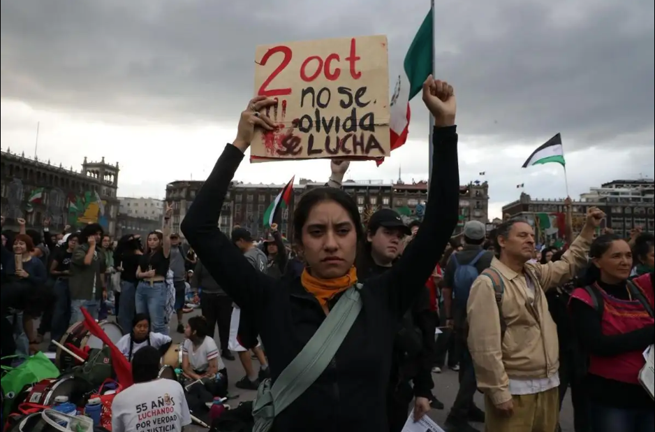 La movilización por los 57 años de la represión estudiantil en la Plaza de las Tres Culturas, en Tlatelolco, arropó -en esta ocasión- entre sus demandas de justicia, el alto al genocidio contra el pueblo palestino.
