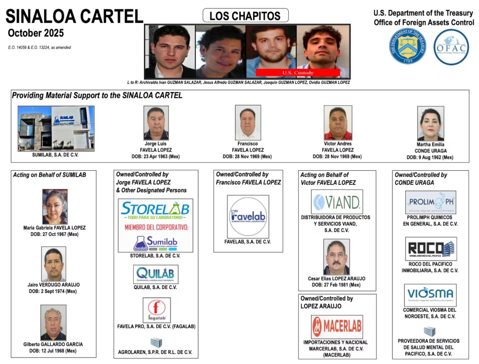 La Oficina de Control de Activos Extranjeros del Departamento (OFAC por sus siglas en inglés) del Tesoro de Estados Unidos sancionó a ocho personas y doce empresas mexicanas afiliadas a la facción Los Chapitos del Cártel de Sinaloa.