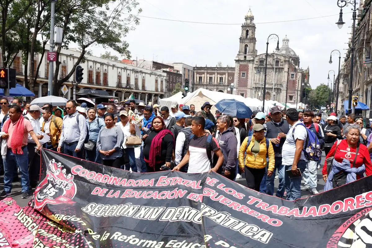 Desde las 12 horas docenas de profesores guerrerenses se concentraron en la plaza de Santo Domingo y avanzaron en contingente hasta el inmueble de la SEP, con un carro de sonido y una lona principal con las demandas centrales de la lucha nacional de la coordinadora.