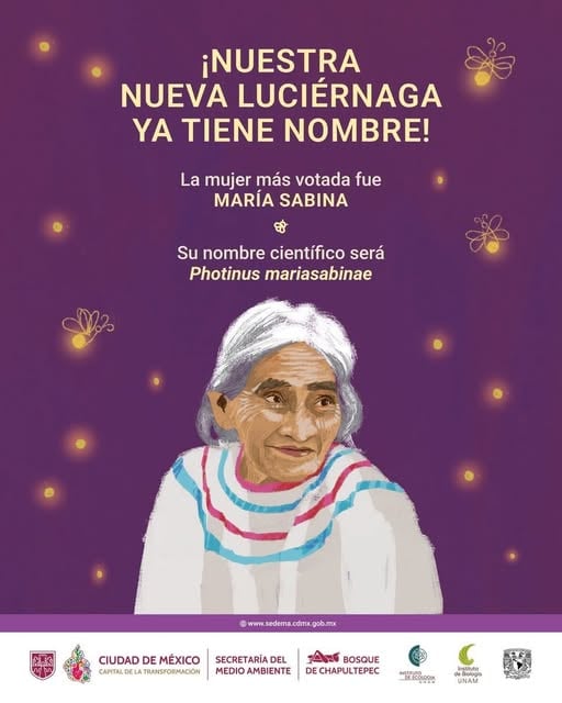 Una nueva especie de luciérnaga fue hallada recientemente en el Bosque de Chapultepec y la ciudadanía participó para darle un nombre inspirado en mujeres mexicanas en la historia, el resultado fue Photinus mariasabinae en honor a María Sabina, una reconocida curandera mazateca reconocida en México y el mundo por sus ceremonias de sanación con hongos sagrados.