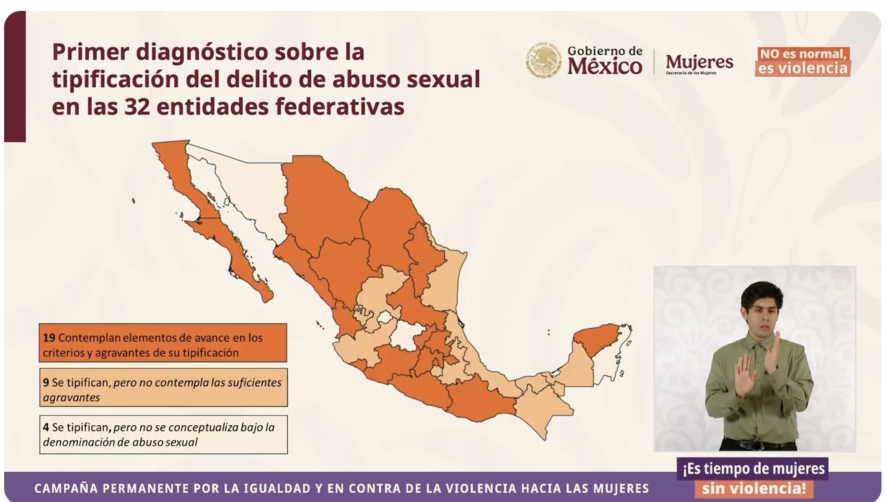 El delito de abuso sexual no está tipificado de manera uniforme en todo el país, pues mientras en 19 entidades existen criterios amplios y agravantes para sancionarlo, en nueve más el tipo penal no está suficientemente fortalecido y en cuatro ni siquiera se define con claridad qué constituye abuso sexual.