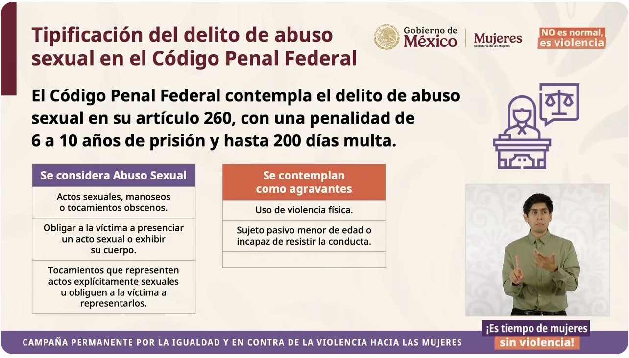 Hernández detalló que, conforme al artículo 260 del Código Penal Federal, el abuso sexual comprende actos como tocamientos obscenos, obligar a presenciar actos sexuales o exhibir el cuerpo de la víctima, con penas de seis a diez años de prisión y hasta 200 días de multa, que se agravan cuando hay violencia física o cuando la víctima es menor o vulnerable.