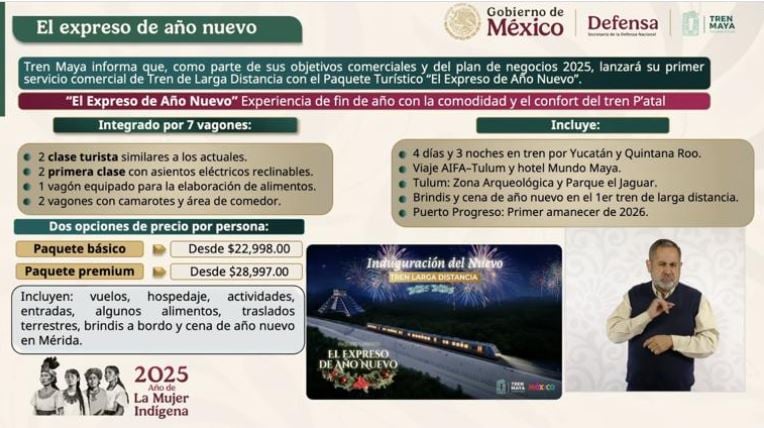 El director general del Tren Maya, Óscar David Lozano Águila, anunció el lanzamiento del primer servicio comercial de larga distancia en modalidad de lujo, denominado Expreso de Año Nuevo. Se trata de un paquete turístico de cuatro días y tres noches que recorrerá puntos clave de Yucatán y Quintana Roo, e incluirá una cena y brindis especial para despedir el 2025 a bordo del tren.