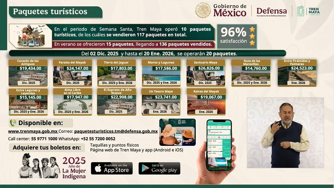Serán un total de 20 paquetes los que el Tren Maya ofrecerá del 2 de diciembre de 2025 al 20 de enero de 2026,entre ellos estarán: Corazón de los Antiguos, por 19 mil 434 pesos; Paraíso del Mayab, por 24 mil 147 pesos; Tierra del Jaguar, por 17 mil 803 pesos; Mares y Lagunas, por 17 mil 586 pesos; entre otros.