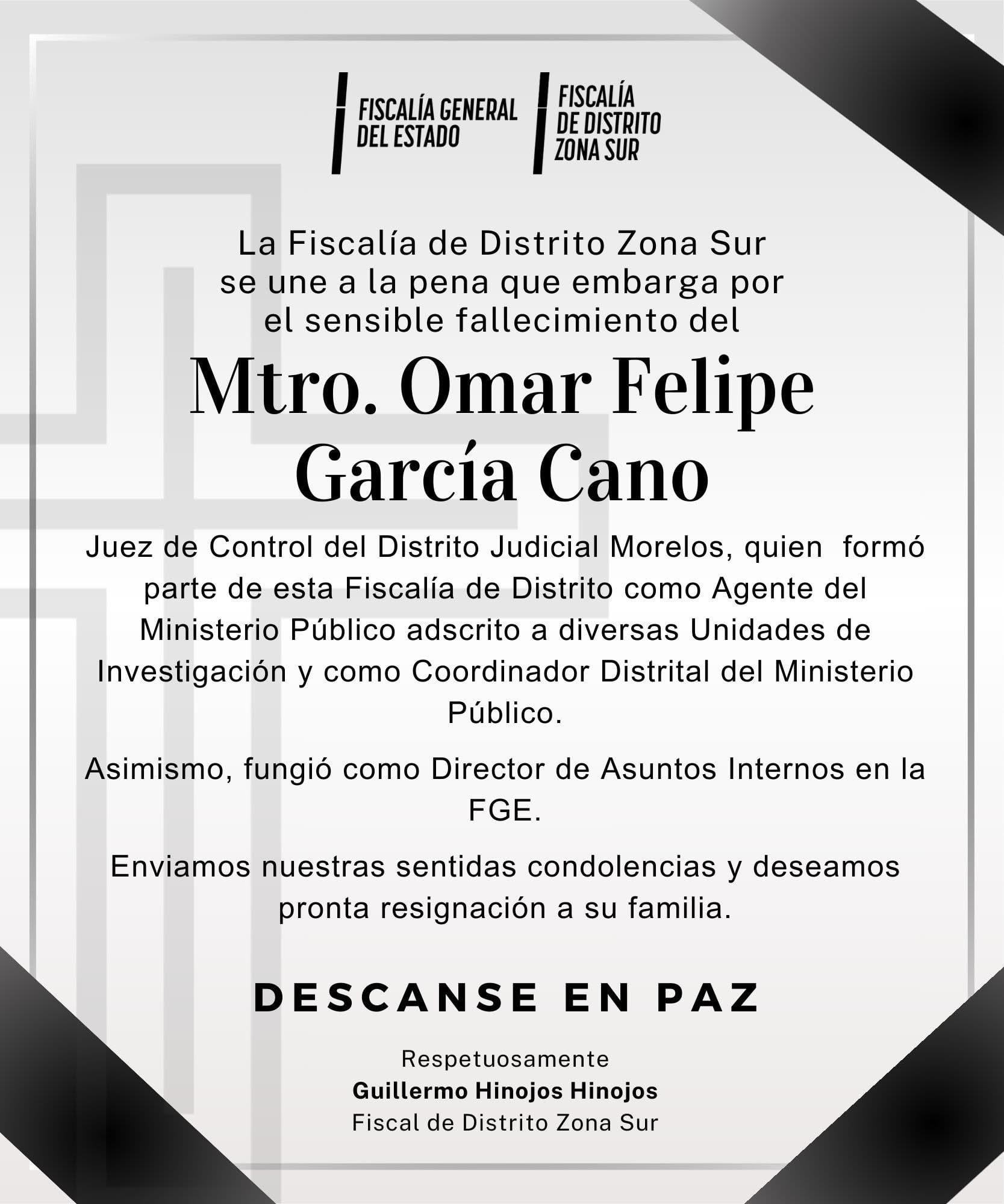 “Reconocemos en él a un elemento loable y altamente comprometido con la impartición de justicia. Su partida deja un vacío en nuestra institución. Extendemos nuestras más sinceras condolencias a sus familiares y amigos en este momento de sensibilidad y dolor”, apuntó.