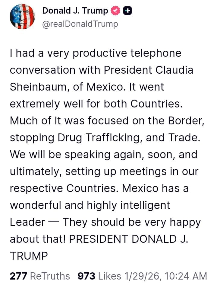 El presidente de Estados Unidos, Donald Trump, afirmó que sostuvo una llamada telefónica “muy productiva” con la presidenta de México, Claudia Sheinbaum, la cual —dijo— resultó “extremadamente positiva” para ambos países. En una publicación en redes sociales, el mandatario estadunidense señaló que la conversación se centró principalmente en temas de frontera, combate al tráfico de drogas y comercio.
