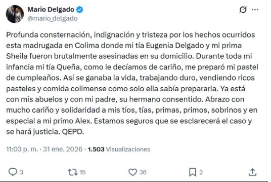 La noche de este sábado, Mario Delgado, titular de la Secretaría de Educación Pública (SEP) expresó su “profunda consternación, indignación y tristeza por los hechos ocurridos esta madrugada en Colima donde mi tía Eugenia Delgado y mi prima Sheila fueron brutalmente asesinadas en su domicilio.”
